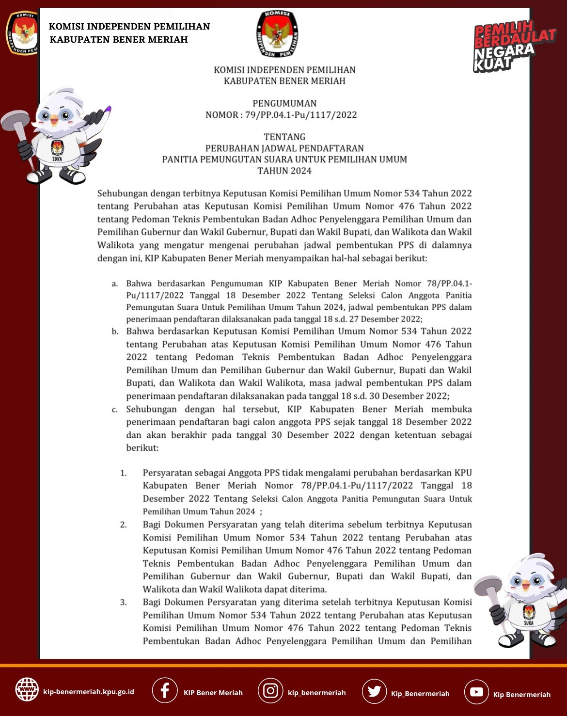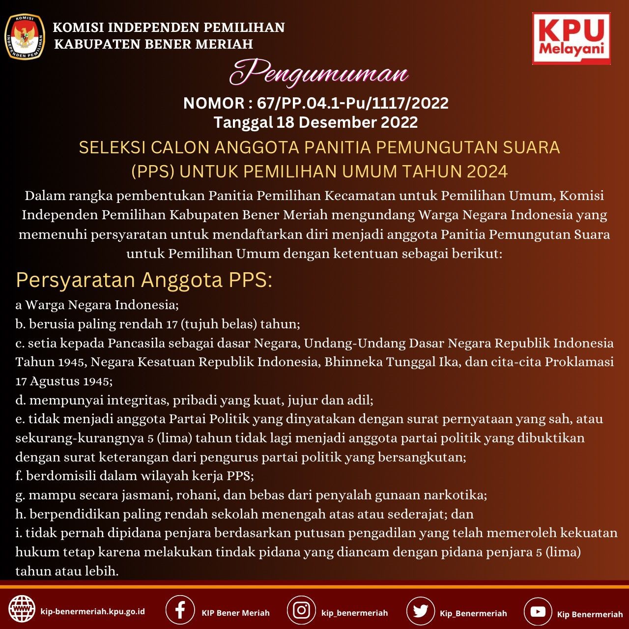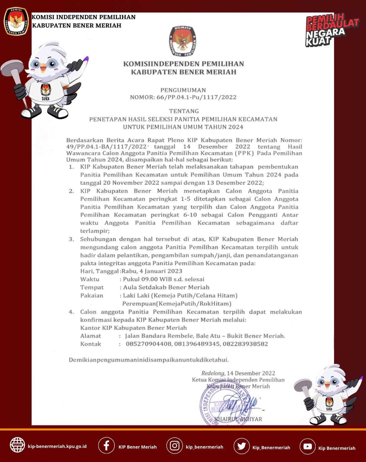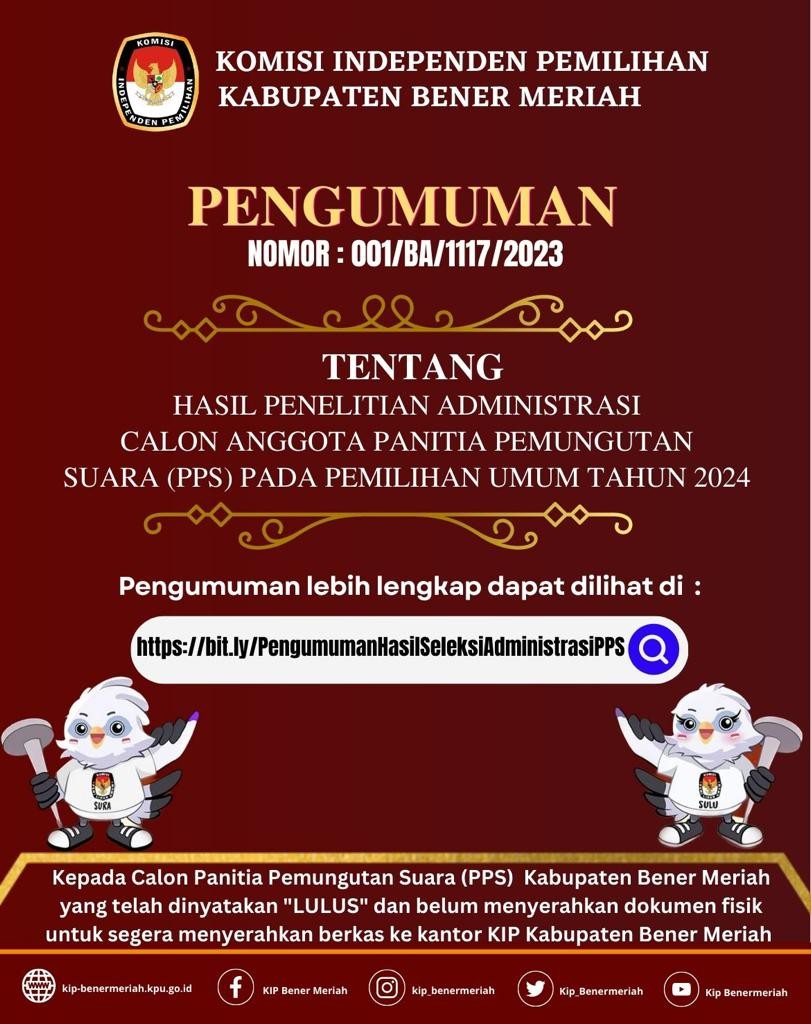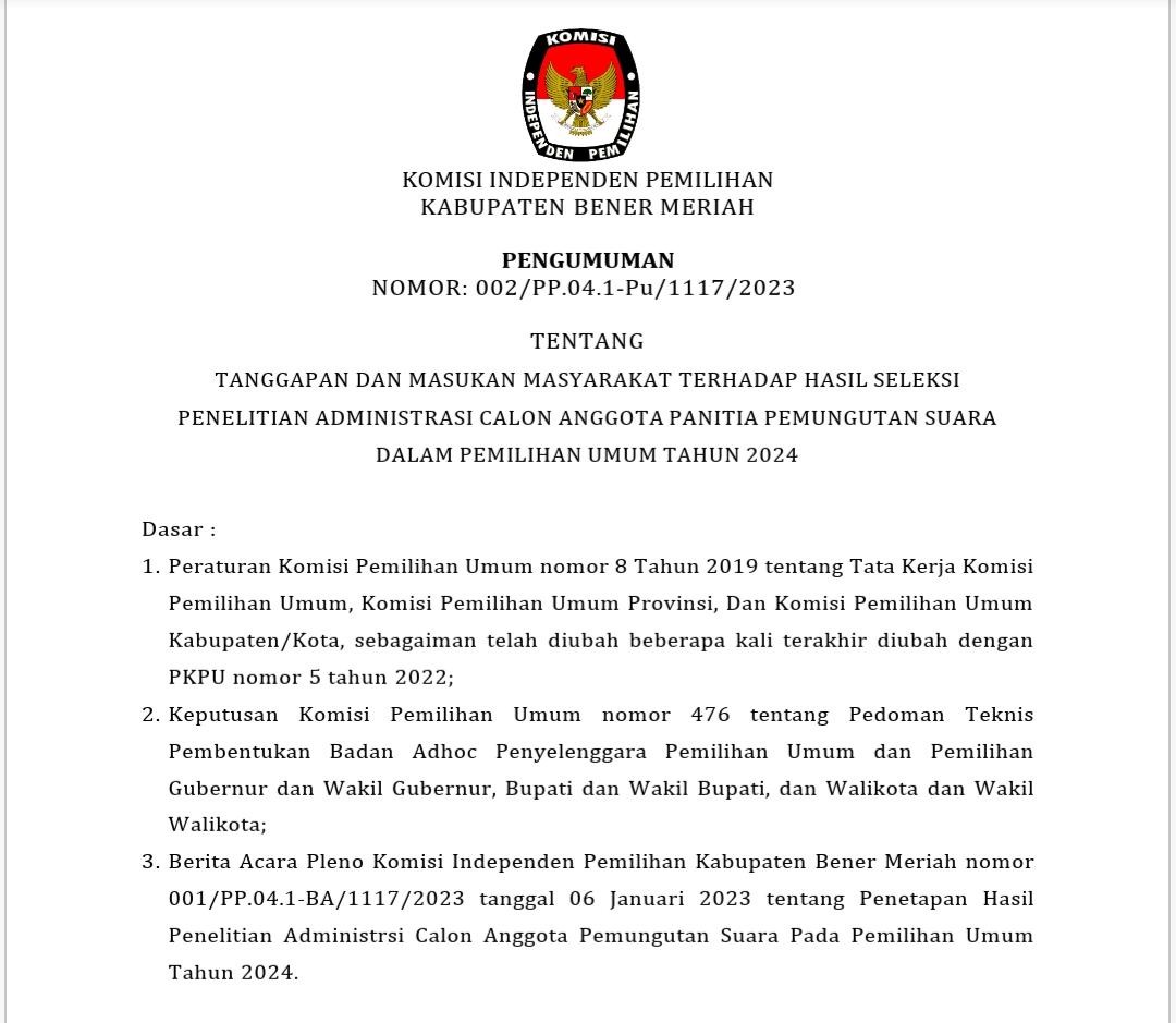KIP Kabupaten Bener Meriah memberi kesempatan kepada masyarakat untuk memberikan masukan dan tanggapan atas nama-nama yang tercantum dalam lampiran Pengumuman KIP Kabupaten Bener Meriah Nomor 001/PP.04.1-Pu/1117/2023 tentang Pengumuman Hasil Penelitian Adminstrasi Calon Anggota Panitia Pemungutan Suara (PPS) pada Pemilu tahun 2024, dengan ketentuan sebagai mana yang tertera di atas.