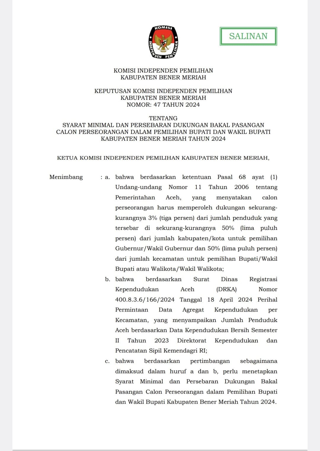 Hai#TemanPemilih ini dia Keputusan Komisi Independen Pemilihan Kabupaten Bener Meriah Nomor 47 Tahun 2024 Tentang Syarat Minimal dan Persebaran Dukungan Bakal Pasangan Calon Perseorangan Dalam Pemilihan Bupati dan Wakil Bupati Kabupaten Bener Meriah Tahun 2024.
