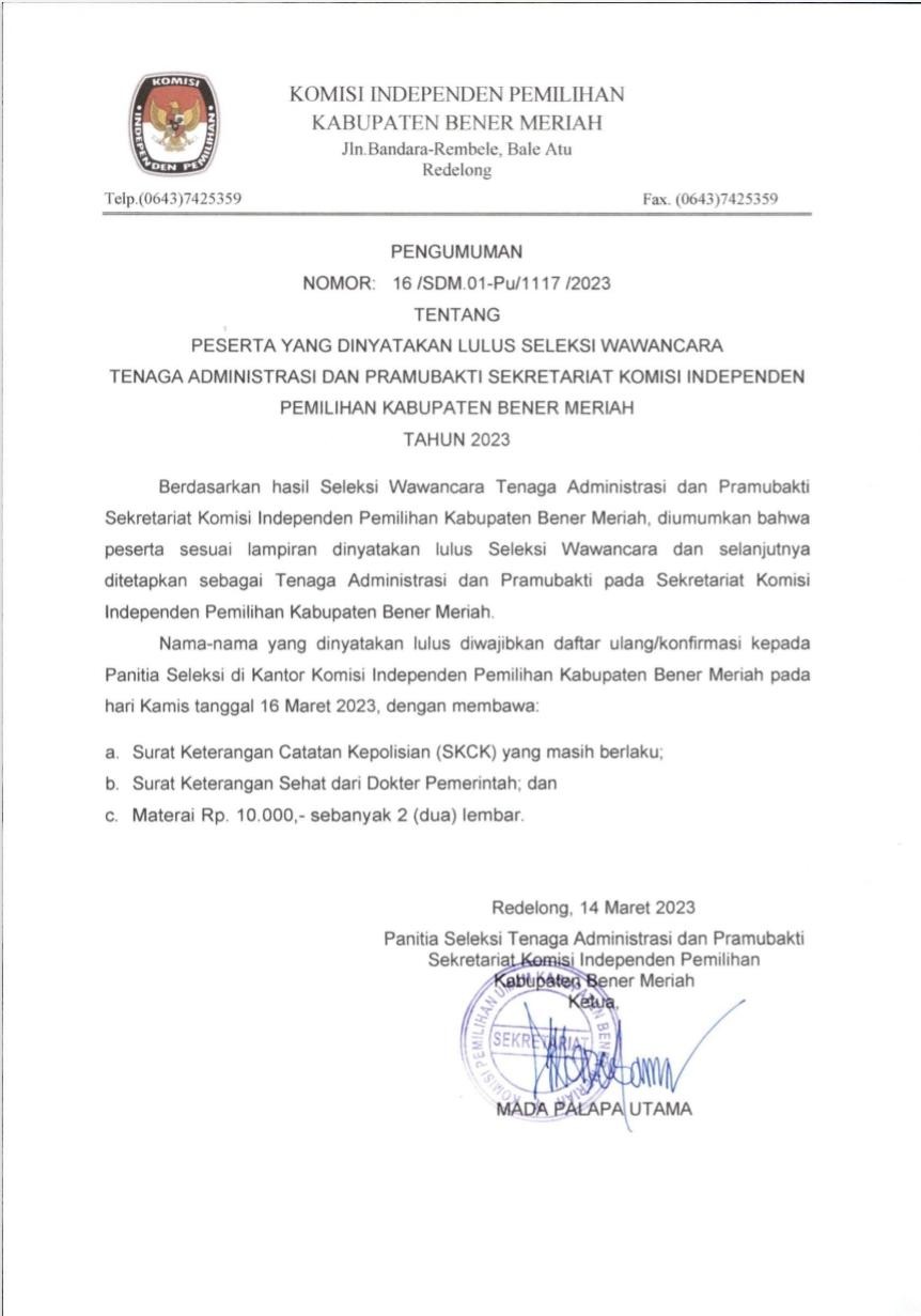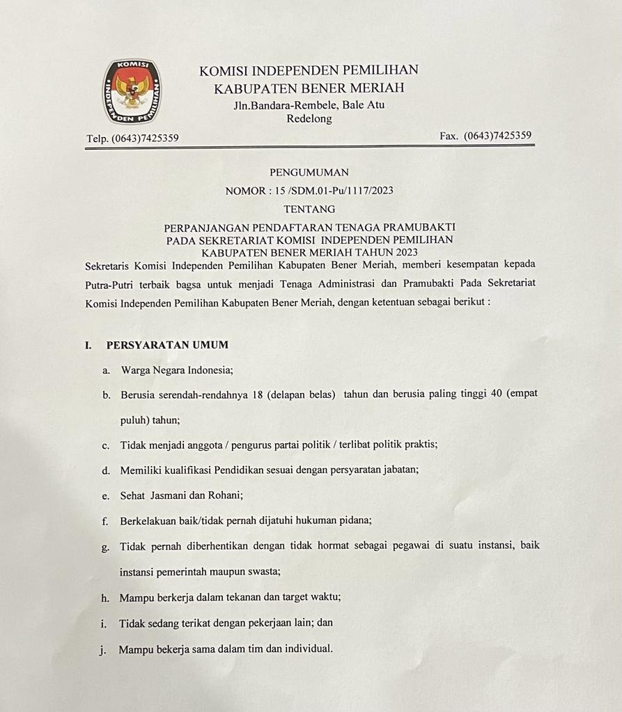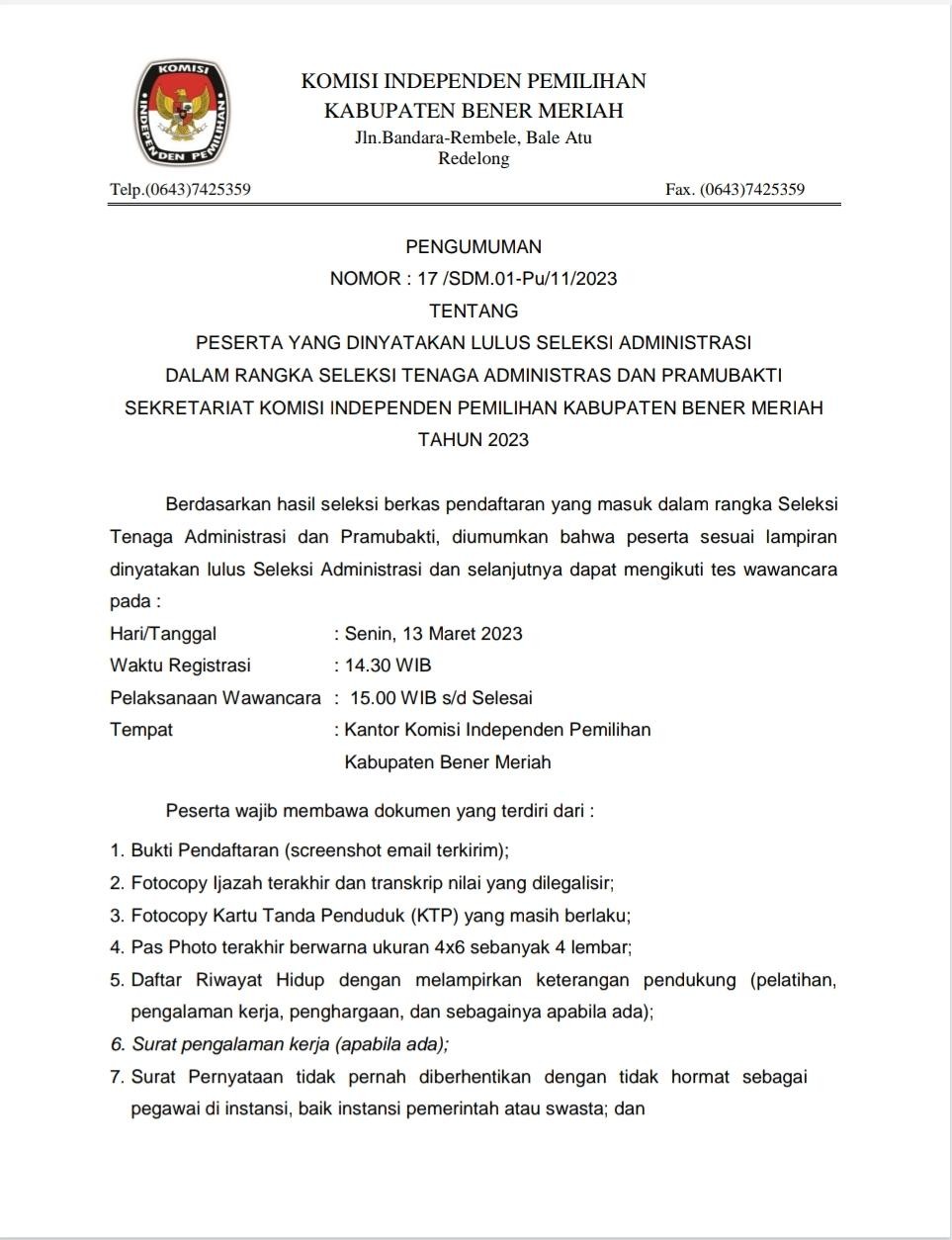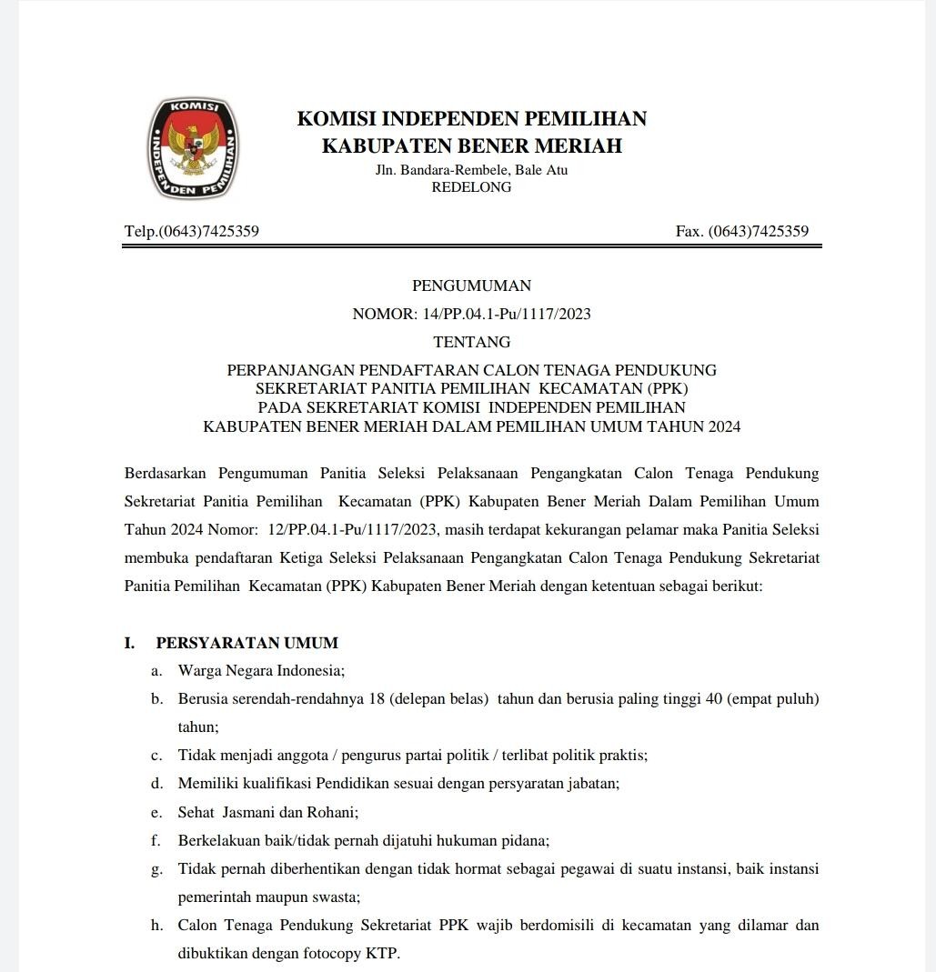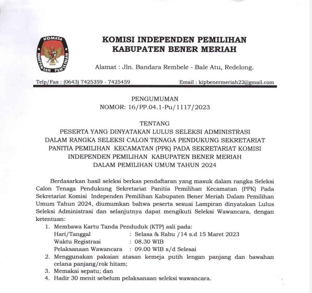 Hai#TemanPemilih ini dia Pengumuman Ketiga Seleksi Pendaftaran Tenaga Pendukung Panitia Pemilihan Kecamatan (PPK) Se-Kabupaten Bener Meriah untuk Pemilu Tahun 2024.